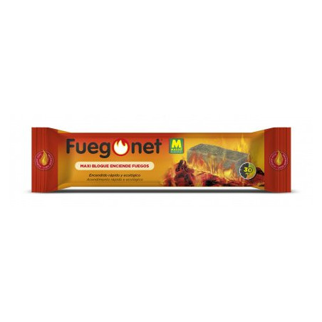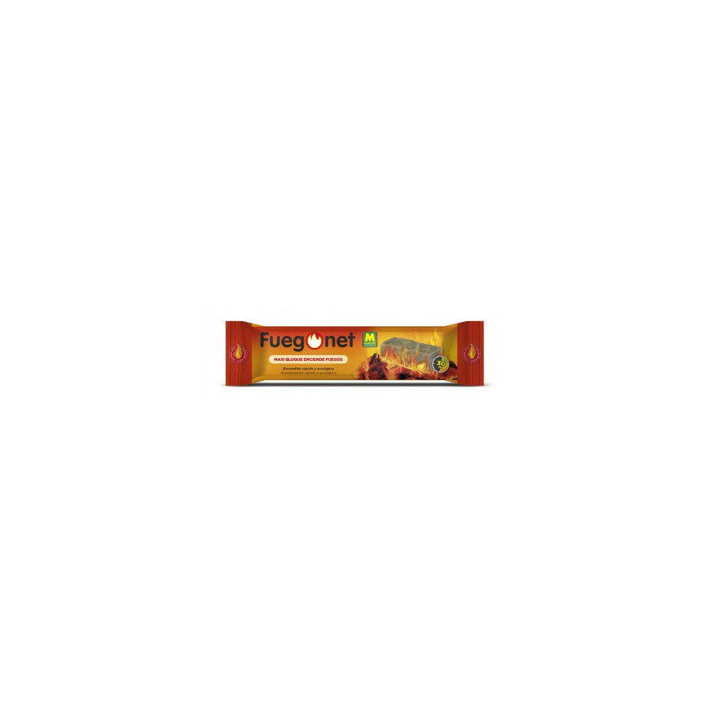 Modo de empleo: coloque el Maxi-bloque con su envoltorio sobre el suelo de la chimenea, estufa de leña, etc y, sin romper ni quitar el papel del Maxi-bloque Fuegonet, enciéndalo por uno de sus laterales.