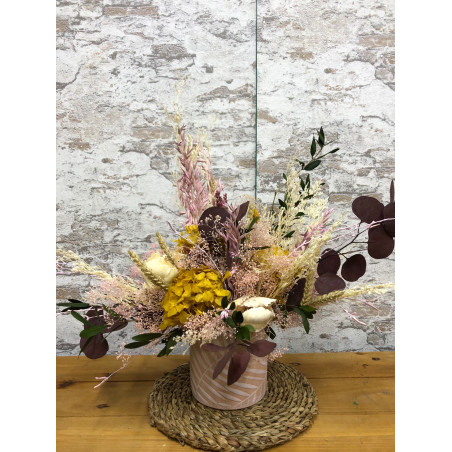 Centro de flor seca en base de cerámica. Puede variar tanto la base como las variedades de flor según disponibilidad, aunque siempre podrás elegir el color.