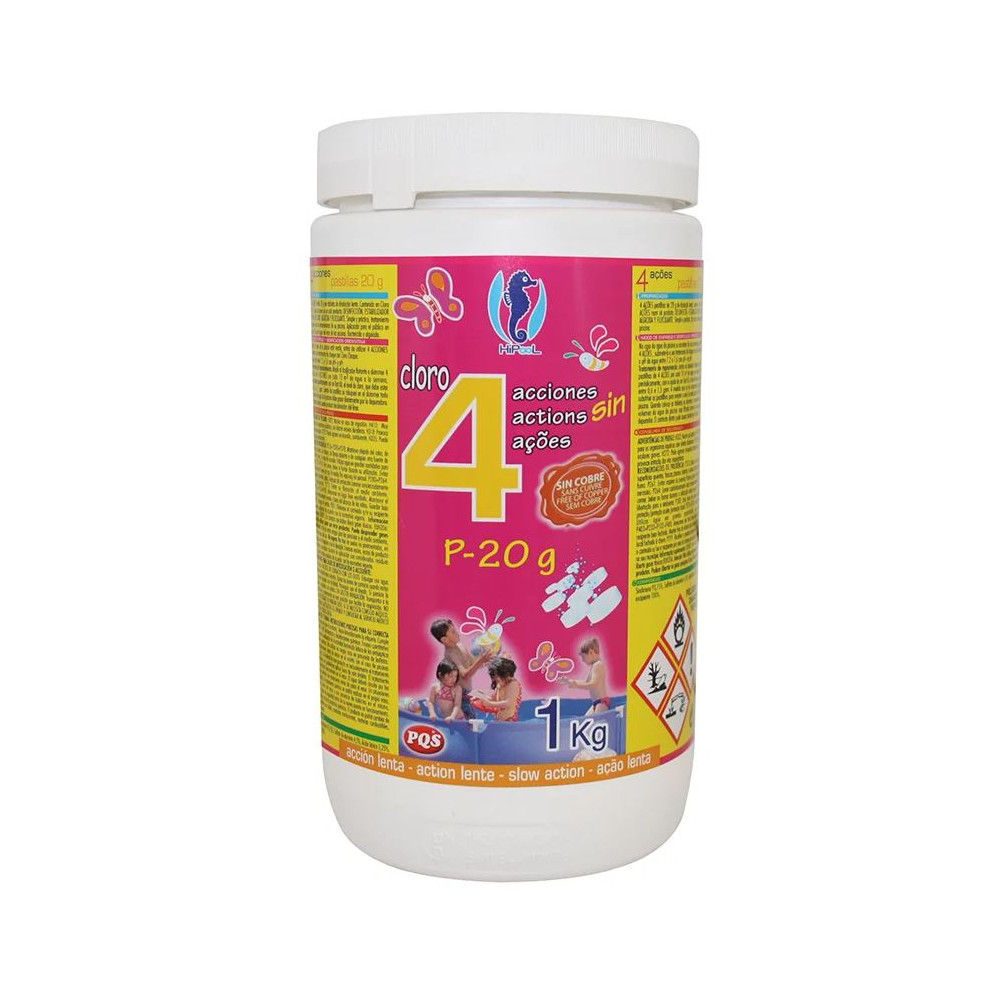 4 Acciones en Pastillas de 20 g -disolución lenta-. Contenido en Cloro> 86%.