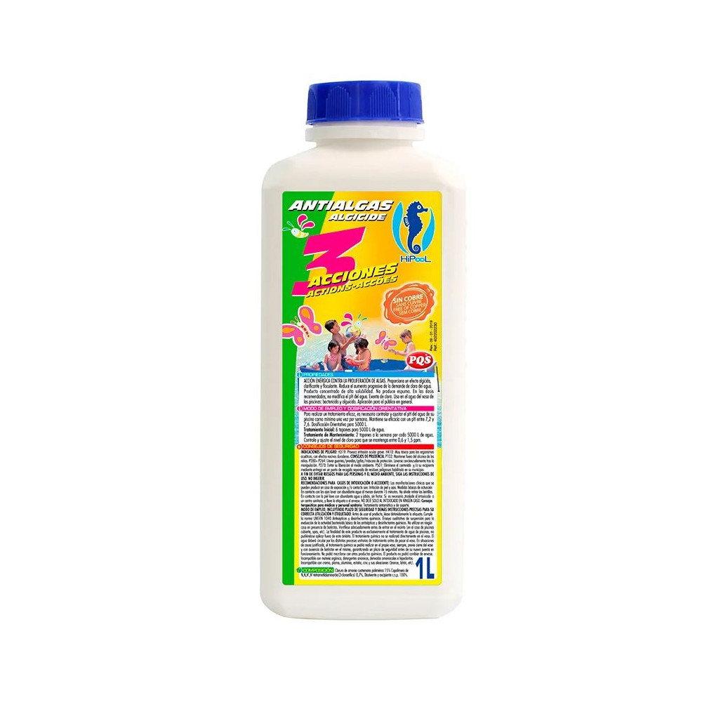 Efecto Algicida, Clarificante y Floculante. No modifica el pH del agua, en las dosis recomendadas. Exento de cloro. No deja residuos. No produce espuma. Alta solubilidad.